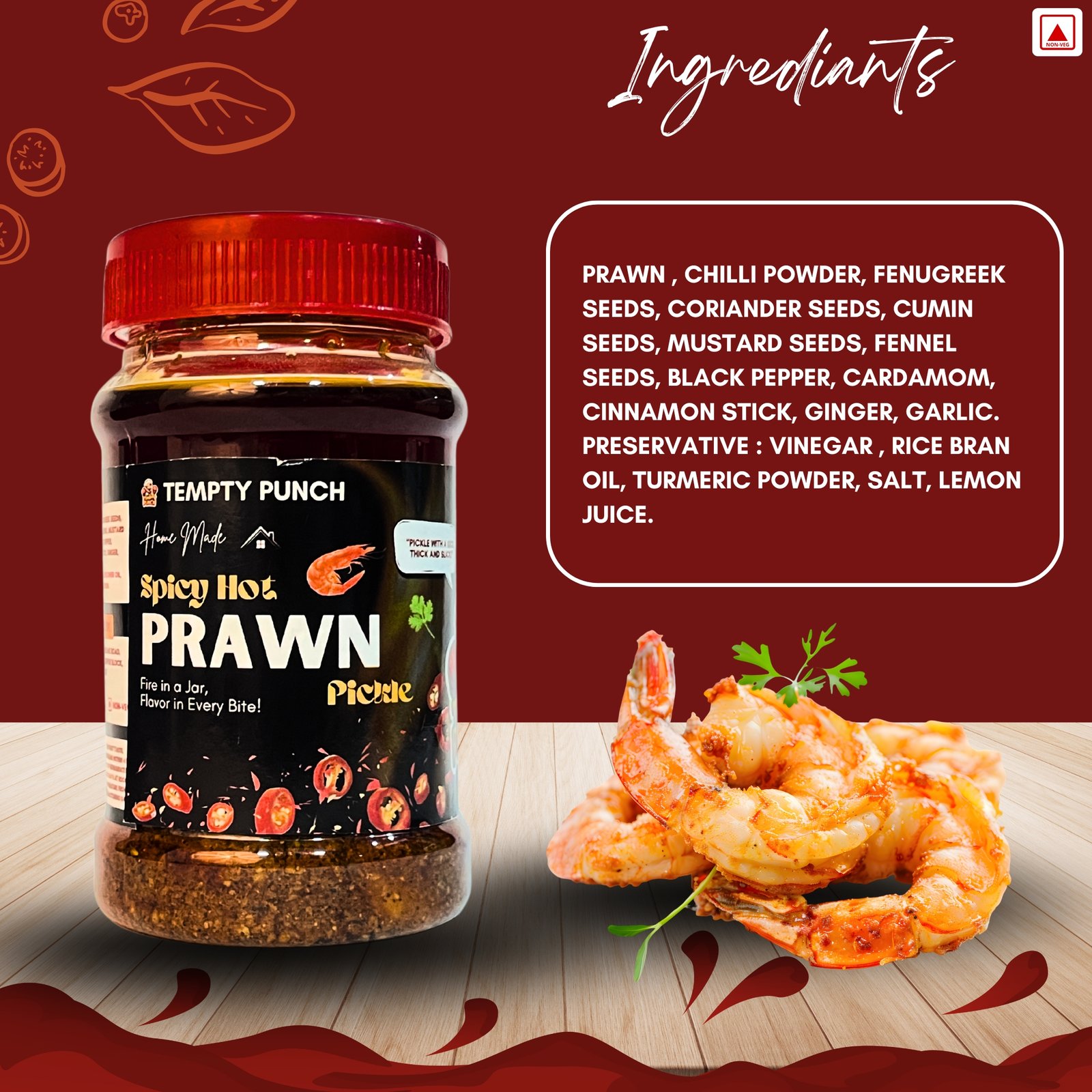 Fresh prawns, cold-pressed oil, red chilli, garlic, ginger, mustard seeds, turmeric, salt, natural preservatives, and premium blended spices.